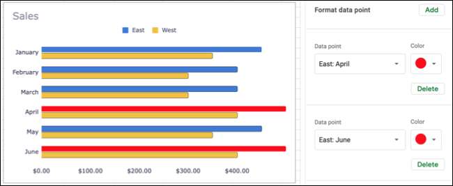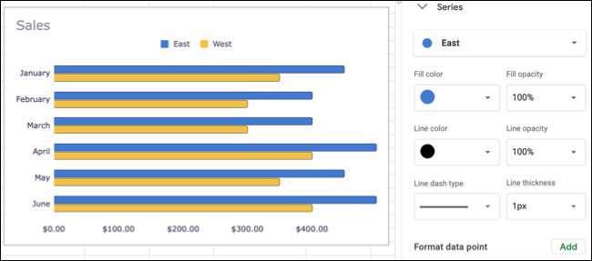 Se você quiser destacar uma barra específica no gráfico, você pode formatá-lo para se destacar. Abaixo das opções da linha na seção da série, clique em "Adicionar" ao lado de Formatar o ponto de dados.