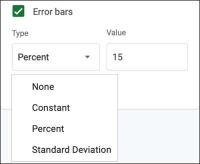 Você também pode adicionar barras de erro ao seu gráfico com base no valor, porcentagem ou desvio padrão. Na parte inferior da seção da série na barra lateral, marque a caixa ao lado de barras de erro.