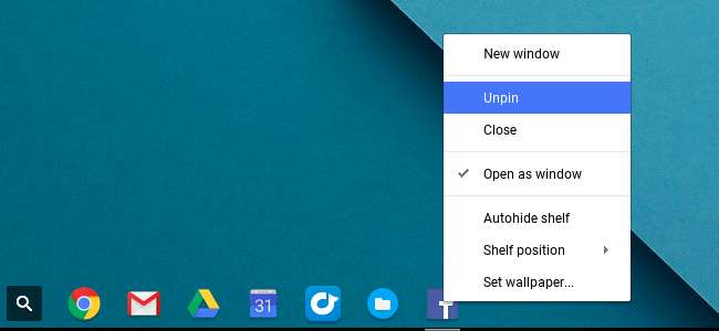 Se você não quiser mais o atalho, basta clicar com o botão direito no atalho em sua prateleira - toque com dois dedos para fazer isso no touchpad de um Chromebook - e selecione “Desafixar”. Você também pode clicar com o botão direito em um atalho e alternar a opção “Abrir como janela” para controlar se esses atalhos são abertos em janelas ou não.