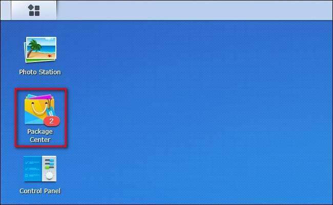 Para iniciar o processo de atualização, basta navegar até a interface baseada na web para seu Synology NAS. Na área de trabalho padrão, você verá o atalho do Centro de Pacotes (se houver pacotes que precisam de atualização, você verá, como na captura de tela abaixo, um indicador vermelho exibindo o número deles). Se você tem fiz uma pequena reorganização da área de trabalho , você sempre pode encontrar o atalho para o Centro de Pacotes clicando no botão semelhante ao Menu Iniciar no canto superior para acessar sua lista completa de aplicativos.