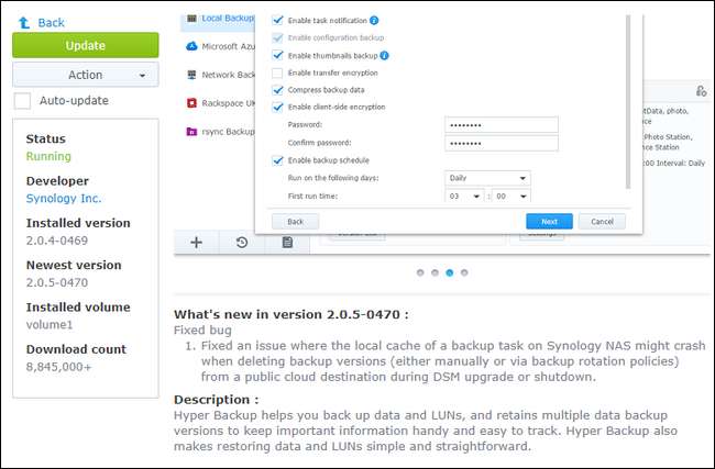 Existem três maneiras de atualizar manualmente seus pacotes. Você pode clicar no botão “Atualizar tudo” para simplesmente rasgar todas as atualizações sem revisão. Você pode atualizar seletivamente selecionando o botão “Atualizar” ao lado de cada entrada que precisa de atualizações. Finalmente, se desejar revisar as notas de lançamento de uma atualização específica antes de aprová-la, você pode clicar na entrada geral de um pacote de aplicativo individual para ver a visão detalhada. Vamos fazer isso agora com o pacote “Hyper Backup” para ver o que a atualização envolve.