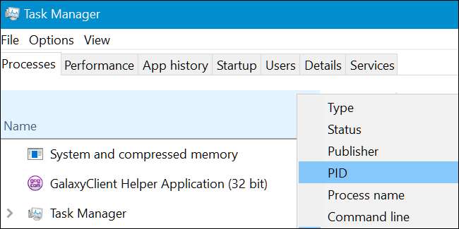 Clique com o botão direito no cabeçalho da guia Processos e ative a coluna “PID”. Se você não vir a guia Processos, clique em “Mais detalhes”.