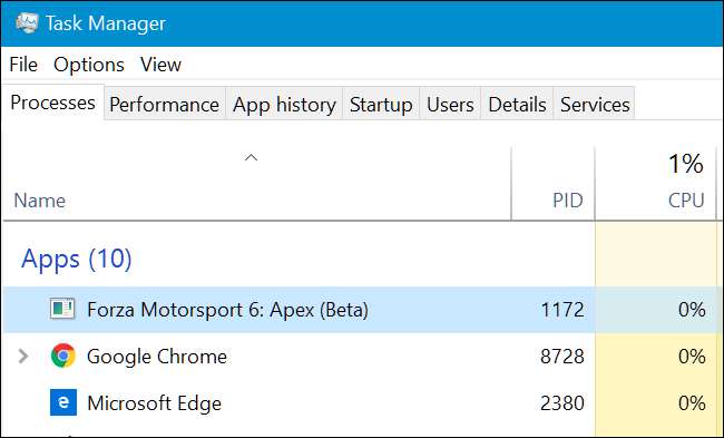 Encontre o jogo UWP em execução que deseja monitorar e anote seu número PID. Este número de identificação do processo mudará cada vez que você iniciar o aplicativo, então você terá que encontrá-lo novamente se fechar e reabrir o jogo.