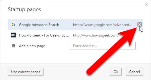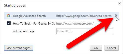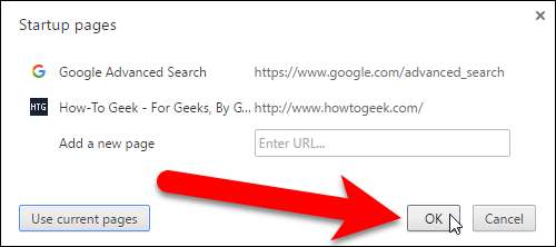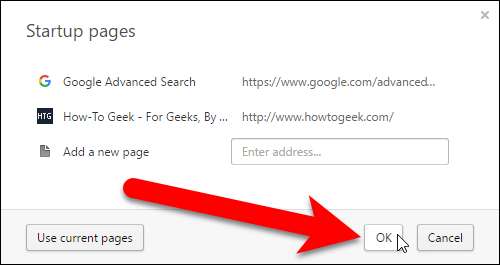 Todas as páginas da web abertas atualmente nas guias do navegador (exceto a guia Configurações) são listadas na caixa de diálogo Páginas de inicialização. Se você deseja adicionar outra página da web que não está aberta no momento, digite o URL dessa página na caixa "Adicionar uma nova página" e pressione Enter. Clique em “OK” assim que tiver sua lista de páginas da web.