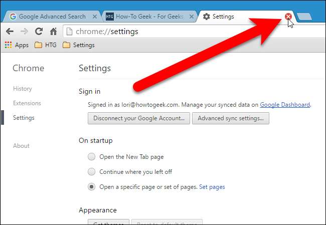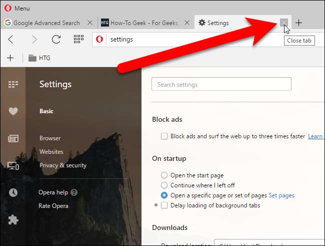 Para fechar a guia Configurações, clique no botão X ”no lado direito da guia ou pressione Ctrl + W no teclado.