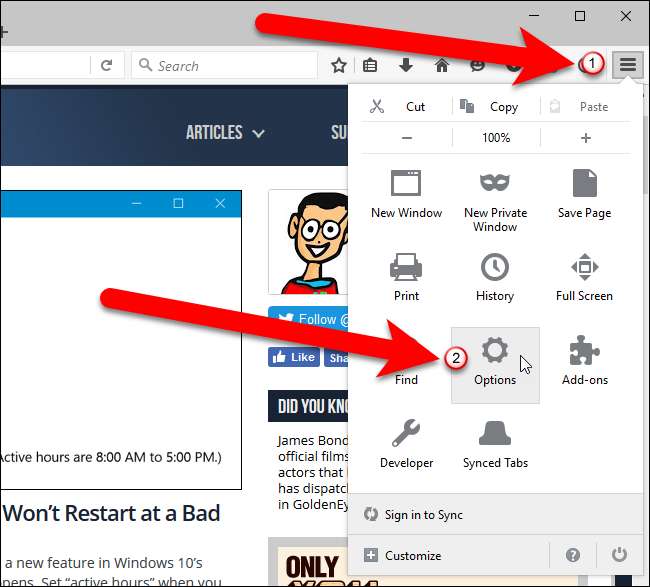 Abra o Firefox e, em guias separadas, visite as páginas da web que deseja abrir automaticamente ao abrir o navegador. Em seguida, clique no botão de menu do Firefox (três barras horizontais) no canto superior direito da janela e clique em “Opções” no menu suspenso.