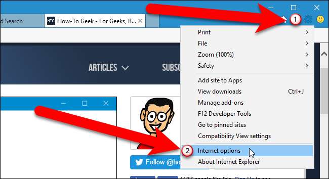 Abra o Internet Explorer e, em guias separadas, visite as páginas da web que deseja abrir automaticamente ao abrir o navegador. Em seguida, clique no botão de engrenagem no canto superior direito da janela e selecione “Opções da Internet” no menu suspenso.
