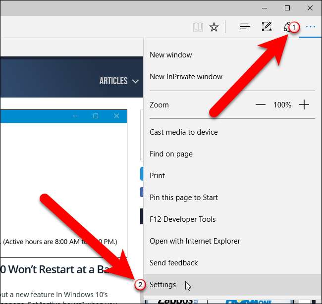 O Microsoft Edge é diferente dos outros navegadores e as páginas da Web que você deseja abrir automaticamente quando o navegador é aberto devem ser configuradas manualmente. Abra o Microsoft Edge e clique no botão de menu (três pontos em uma linha) no canto superior direito da janela do navegador. Em seguida, selecione “Configurações” no menu suspenso.