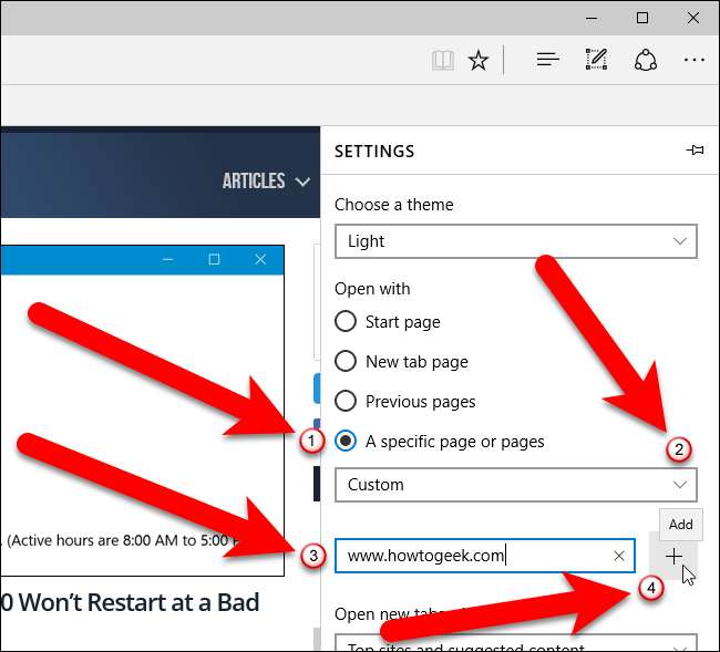 No painel Configurações, selecione a opção “Uma página ou páginas específicas” em Abrir com (1) e selecione “Personalizar” na lista suspensa abaixo da opção (2). Em seguida, insira um dos URLs que deseja abrir automaticamente na caixa abaixo da lista suspensa (3) e clique no botão “Adicionar” (4). Repita (3) e (4) para cada página da web que deseja abrir automaticamente ao abrir o navegador.