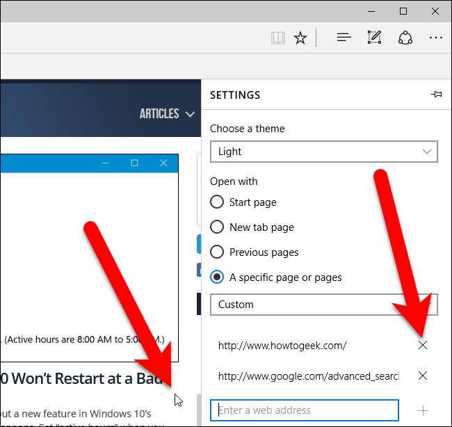 Para remover uma página da web da lista, clique no botão “X” à direita do URL. Clique em qualquer lugar à direita, fora do painel Configurações para fechá-lo.