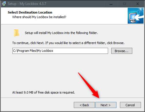 por padrão. Se você quiser alterar o local, clique em "Browse" e selecione o local para instalar o My Lockbox. Caso contrário, clique em "Avançar".