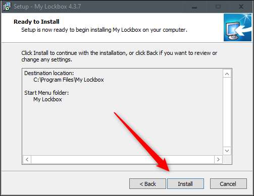 O assistente levará você pelo processo de configuração. As duas primeiras janelas solicitarão que você selecione um idioma e aceite o contrato de licença. Depois disso, você será solicitado a escolher uma pasta para instalar meu Lockbox. Isto é