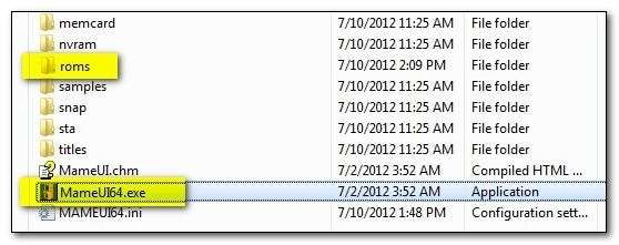 O executável inicia o módulo GUI / MAME e a pasta / roms / é o local padrão para armazenar seus arquivos ROM (você pode alterar o direcionador padrão e / ou adicionar diretórios adicionais a partir da interface do usuário, mas optamos por manter tudo organizado e dentro do estrutura de diretório existente do emulador).