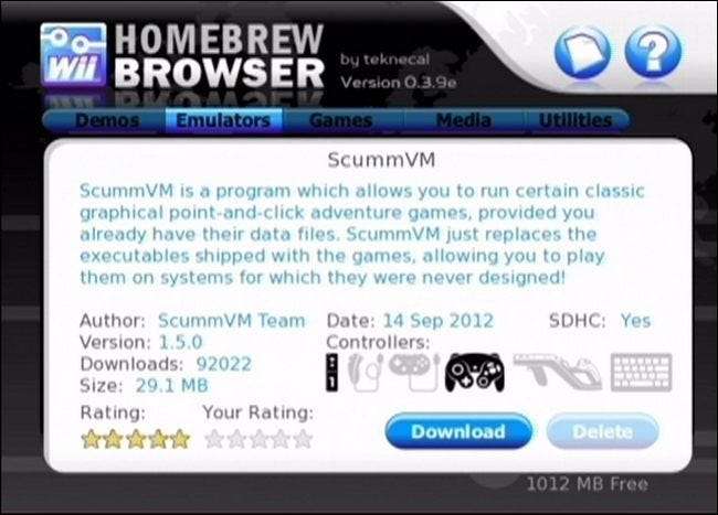 Instalando a partir do Homebrew Channel: Ligue o Wii e inicie o Homebrew Channel na interface principal. Quando estiver no Homebrew Channel, selecione o Homebrew Browser. Depois que o navegador terminar de carregar, navegue até a guia Emuladores e role para baixo até ver ScummVM. Clicar nele irá abrir a entrada para ele assim: