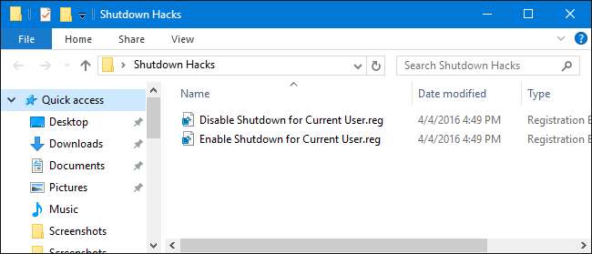 Se você não quiser mergulhar no Registro por conta própria, criamos dois hacks de registro para download que você pode usar. Um hack remove a capacidade de desligamento do usuário atual e o outro restaura a capacidade de desligamento. Ambos estão incluídos no seguinte arquivo ZIP. Clique duas vezes naquele que deseja usar, clique nos prompts e reinicie o computador.