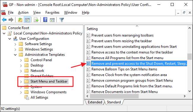 No Windows Pro ou Enterprise, encontre o arquivo MSC que você criou para os usuários aos quais deseja aplicar a política, clique duas vezes para abri-lo e clique em Sim para permitir que ele faça alterações. Na janela Política de Grupo para esses usuários, no painel esquerdo, vá até Configuração do Usuário> Modelos Administrativos> Menu Iniciar e Barra de Tarefas. À direita, encontre o item “Remover e impedir o acesso aos comandos Desligar, Reiniciar, Suspender e Hibernar” e clicar duas vezes nele.