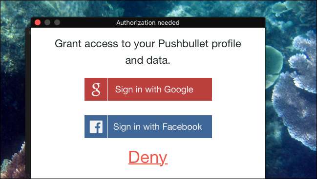 Faça login com sua conta do Google ou Facebook, o que você usar no Pushbullet em seu telefone Android. Se você tiver a autenticação de dois fatores configurada, precisará dessa chave SMS, portanto, tenha seu telefone em mãos.