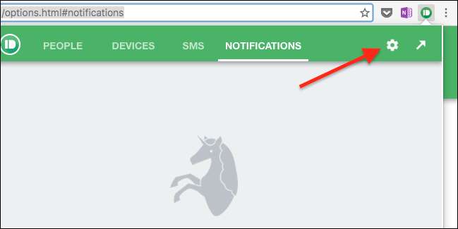Se você usar a extensão Pushbullet em seu navegador - digamos, para os outros recursos avançados do Pushbullet - você pode estar recebendo notificações duplas agora: uma bela e útil de Noti e uma hedionda e inútil de seu navegador. Você não precisa desinstalar a extensão do navegador para parar de ver as notificações do navegador. Abra o plug-in do navegador e clique no ícone de engrenagem no canto superior esquerdo para abrir as configurações.