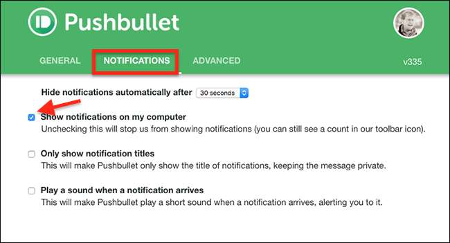 Na janela de configurações, vá para “Notificações” e desmarque “Mostrar notificações no meu computador”.
