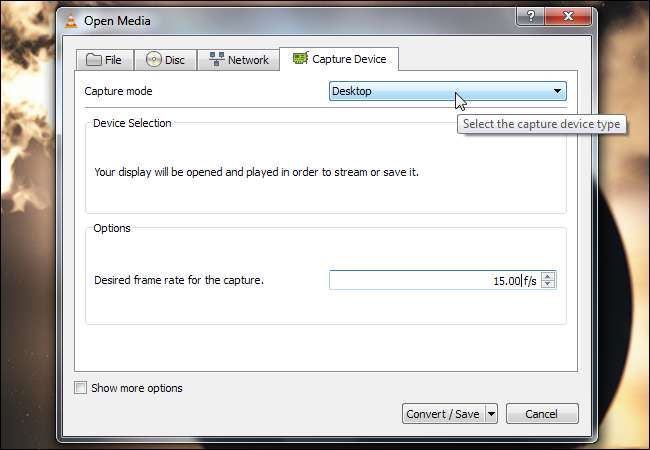 Para capturar e gravar um vídeo de sua área de trabalho em um arquivo, clique no menu Mídia no VLC e selecione Converter / Salvar.