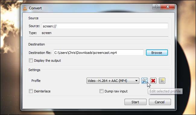 Defina um arquivo de destino na seção Destino. Você pode habilitar o Exibir a saída caixa de seleção para exibir o conteúdo de sua área de trabalho na janela VLC durante a gravação, mas isso não é necessário.