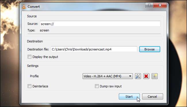 Já cobrimos transcodificação (salvar mídia em um arquivo) com VLC e streaming com VLC . Para gravar sua área de trabalho em um arquivo ou transmiti-lo, execute o processo normal de transcodificação ou transmissão com sua área de trabalho como dispositivo de captura.