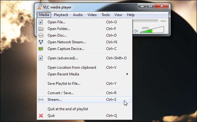 Para transmitir sua área de trabalho pela rede em vez de gravá-la em um arquivo, clique na opção Transmitir em vez da opção Converter / Salvar no menu Mídia.