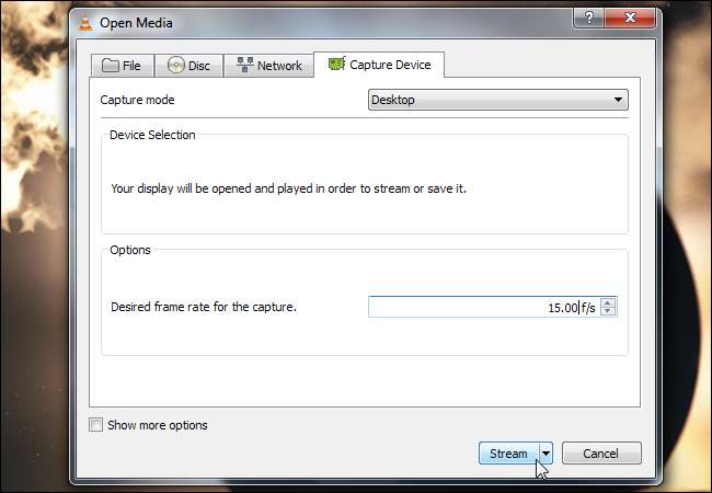 Não se esqueça das configurações no VLC - transcodificar o vídeo para que seja menor irá reduzir a largura de banda. Você também pode aumentar os quadros por segundo que o VLC captura de sua área de trabalho para tornar o vídeo mais suave, embora isso torne seu arquivo de vídeo maior e aumente o uso de largura de banda se você estiver transmitindo.