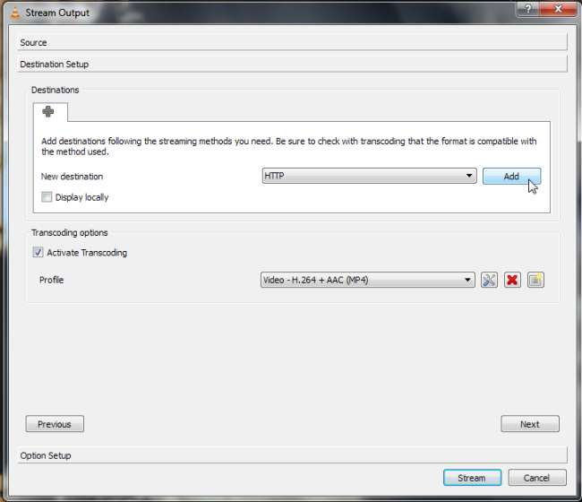 Na seção Configuração de destino, selecione um método de streaming na caixa suspensa e clique em Adicionar. Você também pode controlar a transcodificação e outras opções aqui. Consulte nosso guia para streaming com VLC para obter mais informações sobre como se conectar ao stream de outro computador.