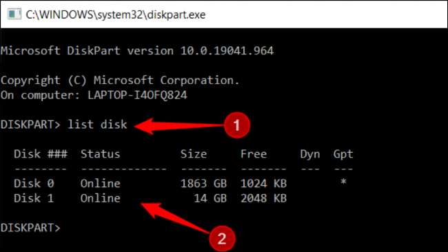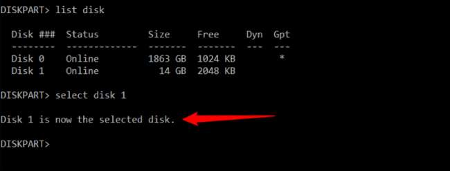 Na lista de discos, você notará o número atribuído do seu dispositivo de armazenamento. Você precisará desta propriedade para selecionar seu dispositivo. Na próxima linha de comando, digite em