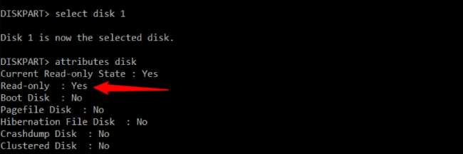 Imediatamente após digitar o comando, pressione a tecla Enter para exibir todos os atributos do seu disco selecionado. Observe que no exemplo abaixo, o atributo lido somente é definido como "Sim".