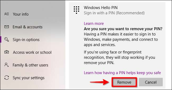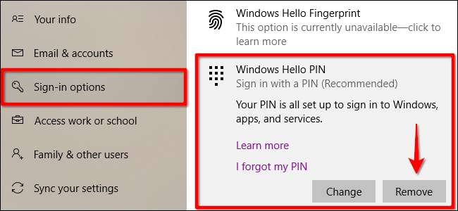 A seção “Contas” abre em “Suas informações” por padrão. Clique na entrada “Opções de login” no menu seguido por “Windows Hello PIN” listado à direita. Esta entrada se expande para revelar um botão “Remover”. Clique uma vez.