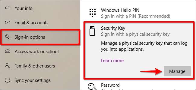 A seção “Contas” abre em “Suas informações” por padrão. Clique na entrada “Opções de login” no menu seguido por “Chave de segurança” listado à direita. Esta entrada se expande para revelar um botão “Gerenciar”. Clique uma vez.