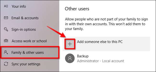 A seção “Contas” abre em “Suas informações” por padrão. Clique na entrada “Família e outros usuários” no menu, seguido do botão “+” ao lado de “Adicionar outra pessoa a este PC” listado em “Outros usuários” à direita.
