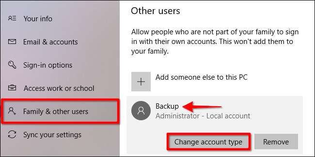 Ao concluir, você verá a nova conta local listada em “Outros usuários”. Selecione a nova conta e clique no botão “Alterar tipo de conta”.