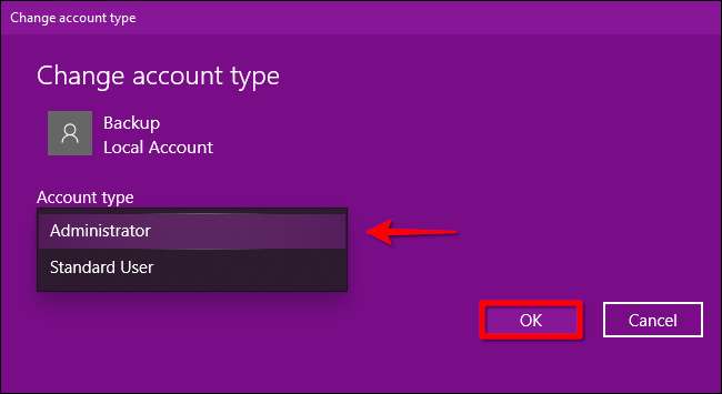 Na caixa pop-up “Alterar tipo de conta”, selecione “Administrador” no menu suspenso e clique no botão “OK”.