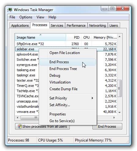 Em seguida, você deve verificar o Gerenciador de tarefas para se certificar de que não há processos sidebar.exe em execução que não deveriam estar Se houver, apenas clique com o botão direito e use Finalizar processo em cada um deles.