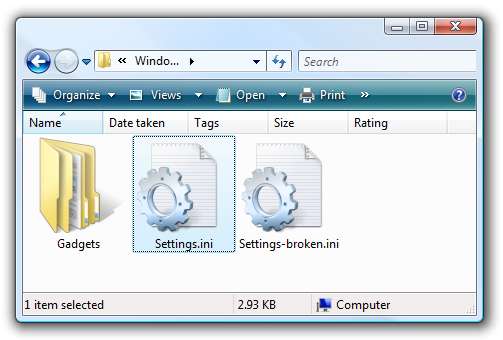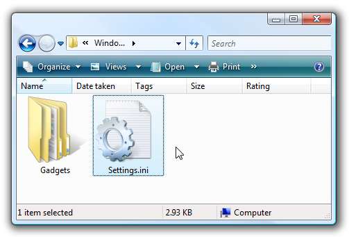 Isso abrirá a pasta de gadgets da barra lateral, onde você deverá ver um arquivo chamado Settings.ini.