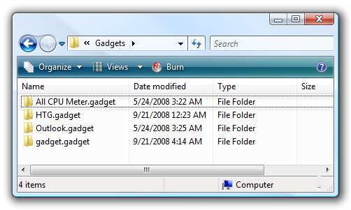 Se ainda estiver tendo problemas com um gadget, você pode abrir a pasta Gadgets que você vê acima, e você verá uma lista de todos os gadgets instalados pelo usuário: