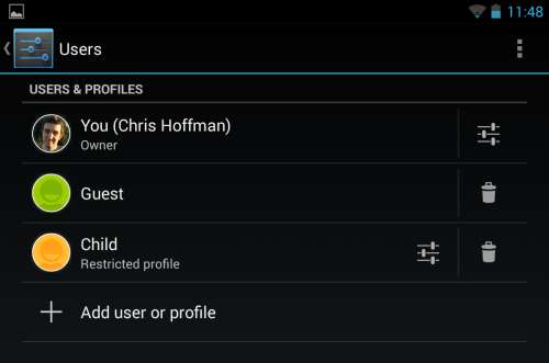 Isso não é tão fácil nas versões anteriores do Android - ou seja, Android 4.4 e inferior. Se você tem um tablet Android rodando Android 4.2, 4.3 ou 4.4, você pode pelo menos crie sua própria conta de usuário Convidado . Os telefones Android estão sem sorte, a menos que o fabricante do dispositivo tenha incorporado algum software de modo visitante personalizado neles - e alguns o fizeram.