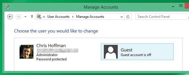 Para habilitá-lo, abra o Painel de controle e navegue até Contas do usuário e segurança familiar> Contas do usuário> Gerenciar outra conta. Clique na conta de Convidado e ative-a.
