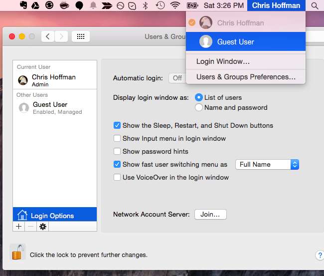 Este recurso é habilitado por padrão, então você pode simplesmente fazer logout clicando no menu Apple e selecionando Log Out e, em seguida, efetuar login com a conta de usuário convidado. Para alterar essas opções, abra a janela Preferências do sistema e selecione Usuários e grupos. Você pode escolher se a conta de convidado está habilitada aqui. Você também pode habilitar o menu “Troca rápida de usuário” aqui, que permite alternar rapidamente entre contas de usuário para que você possa dar a um convidado acesso rápido à conta de convidado sem primeiro fazer logout do Mac.