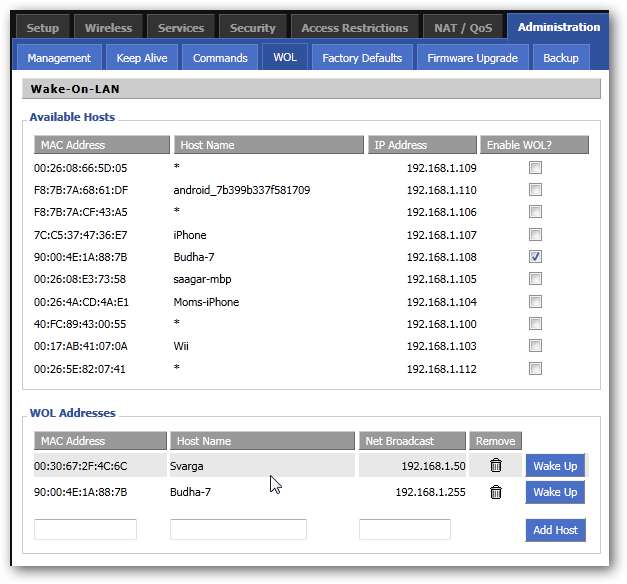 Isso funciona sem qualquer configuração extra para computadores conectados ao seu roteador por Ethernet. Se você usar DHCP estático para atribuir IPs por endereços MAC, você pode até mesmo acordar computadores (mas não desligados) que estão conectados sem fio - apenas certifique-se de usar o endereço MAC da placa wireless e não a placa Ethernet. Observe também que os pacotes WOL são enviados de dentro da rede, então mesmo que você não esteja configurado para acesso remoto, isso ainda funcionará.