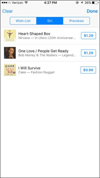 Infelizmente, esta lista não mostra músicas que você não pode comprar na loja. Também não mostra músicas que a Siri não conseguiu vincular imediatamente a uma opção de compra, mesmo que essas músicas estejam disponíveis na loja do iTunes. Não conseguimos definir exatamente quando isso acontece, mas parece que acontece com mais frequência quando mais de uma versão de uma música está disponível na loja. No entanto, há uma solução alternativa.