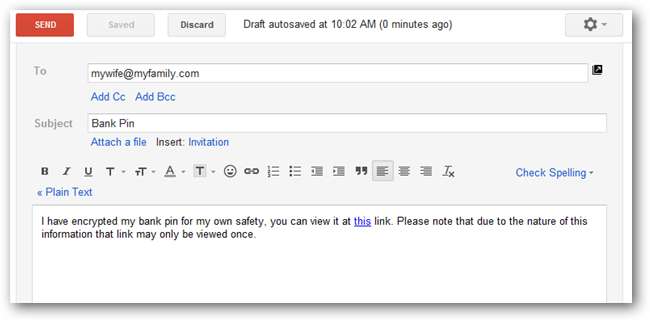 Agora você pode rascunhar seu e-mail como faria normalmente. Você deve adicionar o link que recebeu na última etapa em algum lugar do e-mail. Depende de você decidir se deseja que o destinatário saiba que o link se autodestrói ou não.