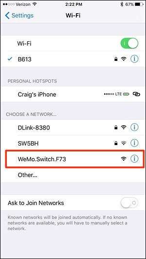 Conecte-se à rede WeMo Switch Wifi selecionando-o. Não haverá uma senha para inserir e ele se conectará automaticamente.