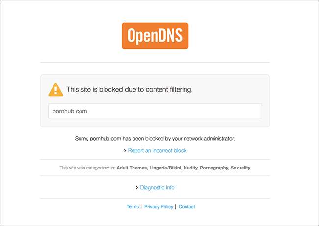 A maioria das pessoas usa qualquer serviço DNS que seu provedor de internet ofereça, mas você pode alterar os servidores DNS do seu computador (ou rede) a qualquer momento. Opções de terceiros, como OpenDNS, oferecem maior velocidade ou outros recursos, como filtragem de conteúdo. Se você configurar o controle dos pais do OpenDNS, verá a tela a seguir ao tentar acessar um site restrito.