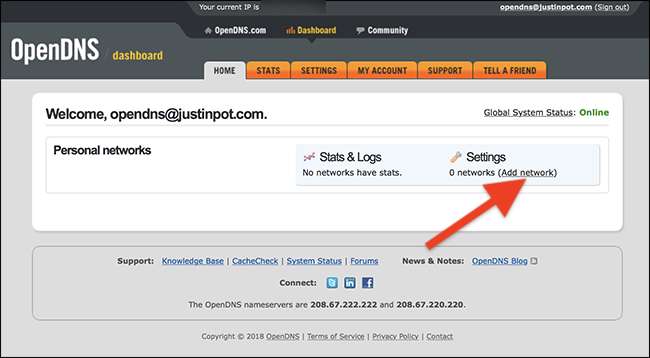 Depois de configurar sua conta, você verá a página inicial do back-end OpenDNS, que parece um pouco antiquada. Não importa: clique na opção “Adicionar rede”.