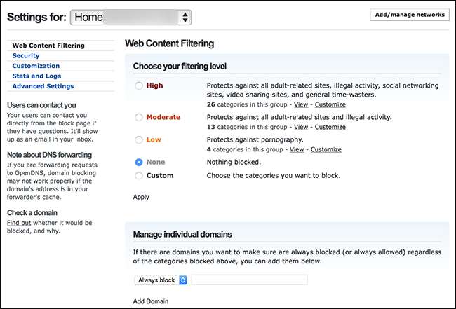 A desvantagem: este serviço realmente só funciona na sua própria rede. Este é provavelmente o motivo pelo qual o OpenDNS não está empurrando esse serviço muito fortemente em nossa era móvel, mas ele ainda está disponível para aqueles que desejam controle granular sobre suas redes domésticas.