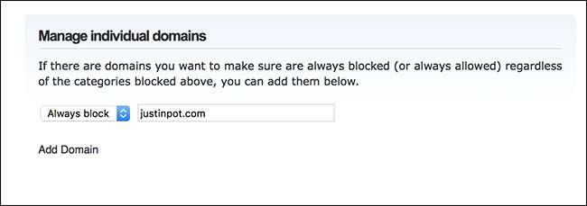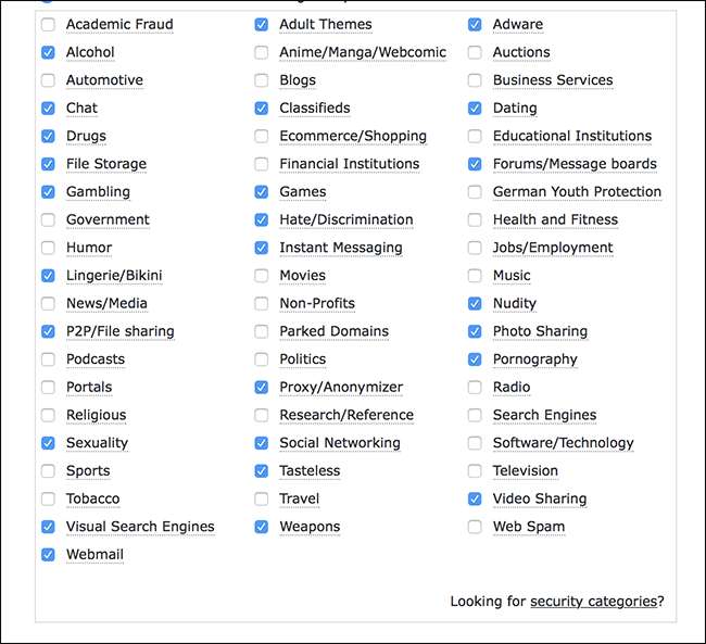 Se bloquear conteúdo adulto não for suficiente, verifique OpenDNS Home Internet Security . Este serviço permite que você entre em uma conta e bloqueie categorias inteiras de conteúdo, dando a você muito controle.